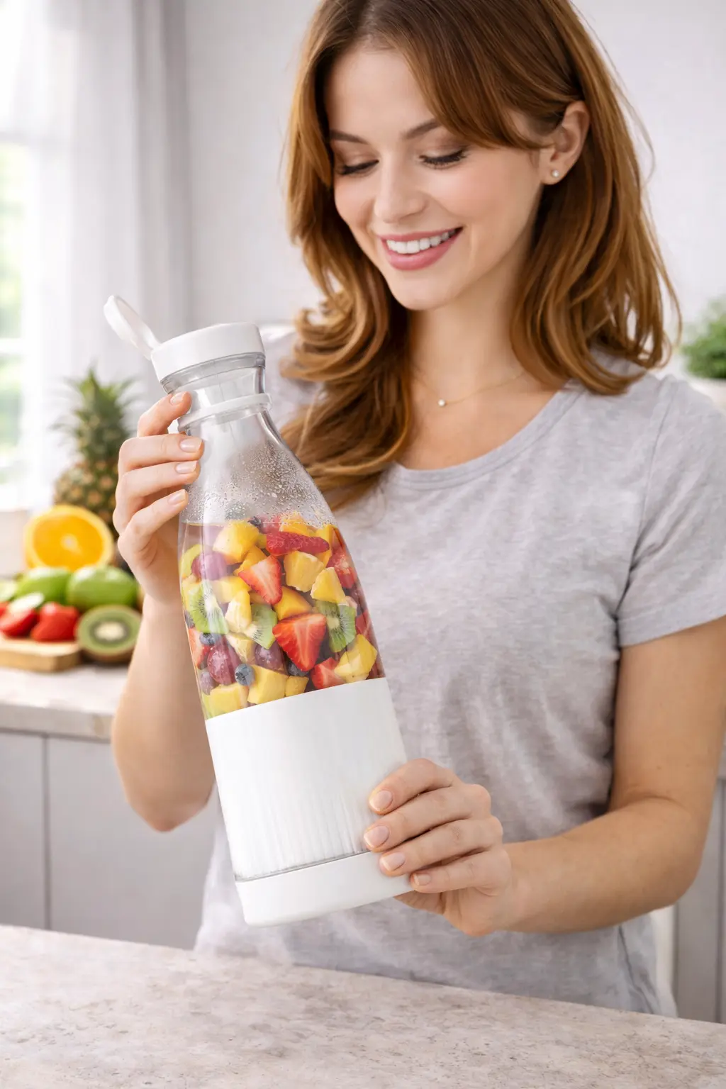 La Mini Licuadora Portátil USB es perfecta para preparar licuados, batidos, jugos y smoothies en cualquier lugar. Compacta, liviana y fácil de llevar, es ideal para quienes buscan una opción práctica para el gimnasio, la oficina, viajes o uso diario.
