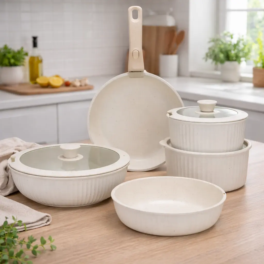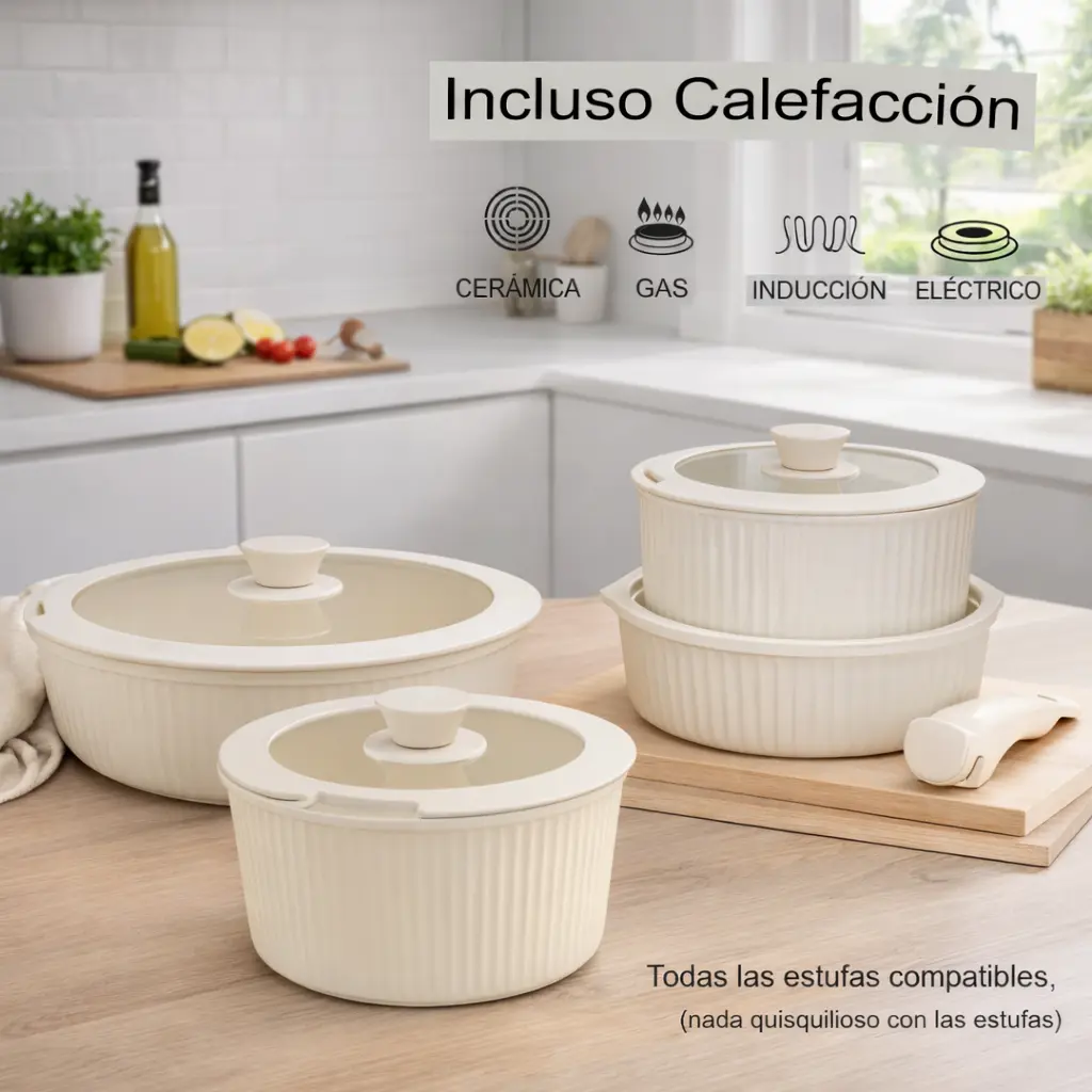 Este set es compatible con todo tipo de cocinas: gas, eléctrica, cerámica e inducción, adaptándose a tu hogar sin complicaciones. Además, su estética moderna y tonos neutros aportan un toque elegante que luce increíble tanto en la cocina como en la mesa.